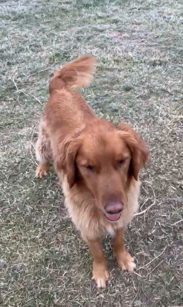 Golden Retriever Doug, born 12/27/2020, is an altered male who loves other dogs. He was a service dog for a veteran for a number of years, but returned when the veteran could no longer keep him. Doug loves to play fetch alone or with a group. He has solid recalls, downs, and more. Does great with grooming hair, nails, and all. Great with cats and kids.