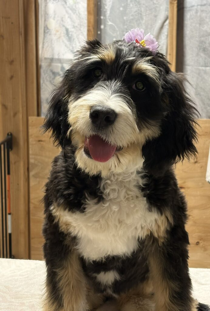 Bernadoodle Spudnick, born 10/15/2024. is an altered female who weighs 58 pounds. Spudnick can be a little shy to start, but warms up pretty quickly. Shen enjoys her grooming time and loves to play with other dogs. She does great with people, kids, and cats. She will play fetch. Her recall and down are awesome.